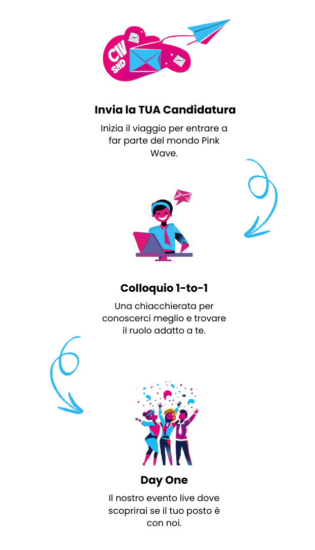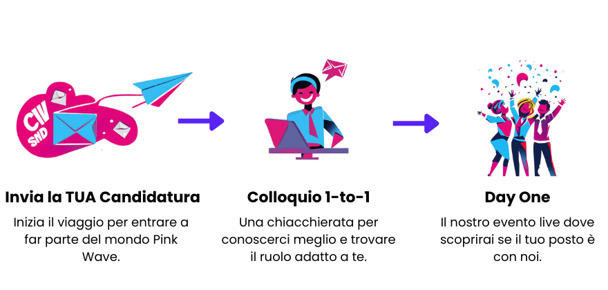Diventare animatore Pink Wave è molto semplice MA non è da tutti. Abbiamo sviluppato un’innovativa selezione in più fasi che ti permette di farti conoscere al 100% sia dal punto personale che professionale e artistico.